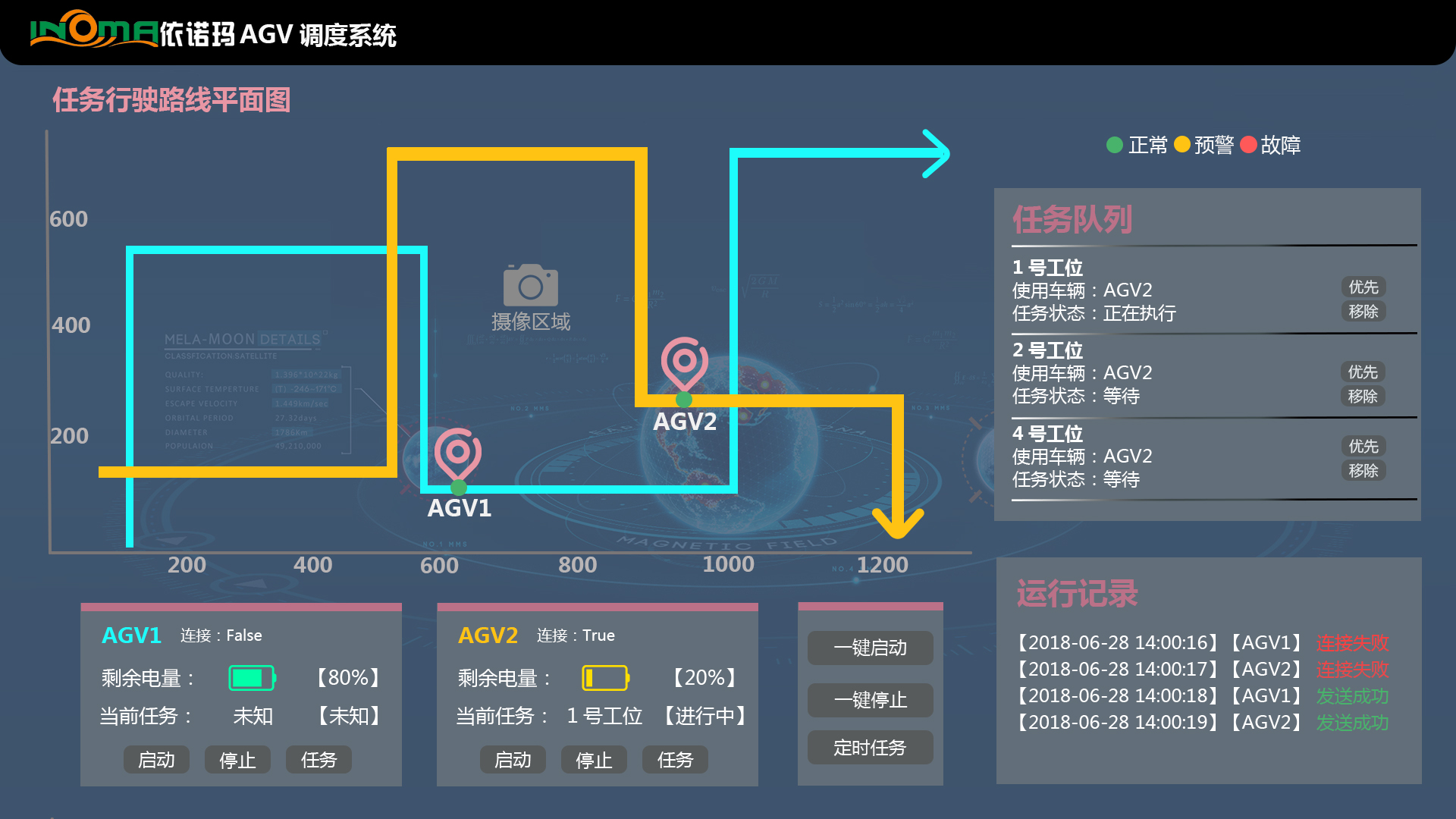 依諾瑪AGV自動換電系統:電量低于設定百分比,自動充電; 2.電量高于設定百分比,結束充電; 3.間隔時間充電; 4.充電時間到,結束充電;5.空閑時間,自動充電。